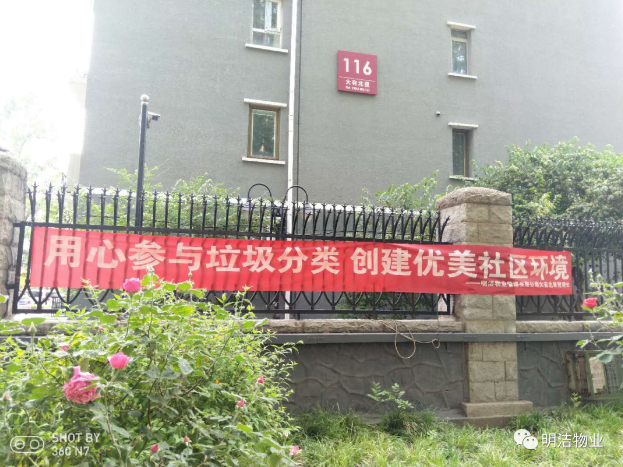 首先,为提升居民垃圾分类意识,提高垃圾分类的分辨能力,明洁物业各管理处进行了广泛的前期宣传,并将十余个垃圾分类宣传条幅悬挂在辖区醒目的位置,使宣传范围遍布整个辖区。