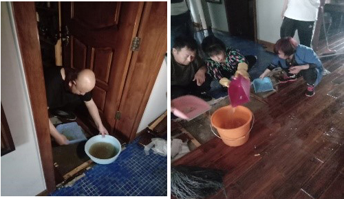 "这里,这里,换桶,倒水……"通过近六个小时的奋战,各位参战人员拖的拖、倒的倒,渐渐地水位下降露出了地板,随后大家又撬开地板进行深度清理,拖净木地板下几公分深的水。