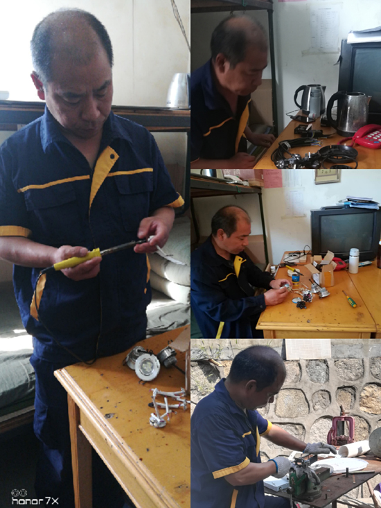 自从他入职以来,在把日常工作做好的同时,利用闲暇时间和值夜班时间,在别人聊天或捧着手机兴高采烈玩游戏时,王占伍却手拿修理工具专心致志的在修理一些废弃器 具。在短时间内,就修复了废弃的电水壶40多个、LED射灯50多个,还有其他许多电器、电子设备等。特别是对于那些已不能维修的器具,他始终坚持着能修的一定得修,不能修的要拆下好的部件留做维修备用零件。而在修理的过程中,哪怕是换一个电水壶的底座、耦合开关、插头等这些小的问题,他也从不马虎敷衍认认真真去维修。尤其是修理LED射灯时,修复难度较大过程复杂,他先通过仪表检测仔细判断灯珠好坏,然后用电烙铁取换烧坏的灯珠,灯珠非常小,在焊接的时候,很难掌控固定的位置,还必须看准灯珠的+-正负极方向,不能接反。王占武每次都能克服各种疑难问题,进行精准的焊接。更令人感动的是为了方便修理他经常从自己家里拿来修理所用的物料,像硅滑胶之类的,还有一些小部件等。在他的办公桌上永远都有一些器具部件,工作室里总能看到他修理器具的身影。