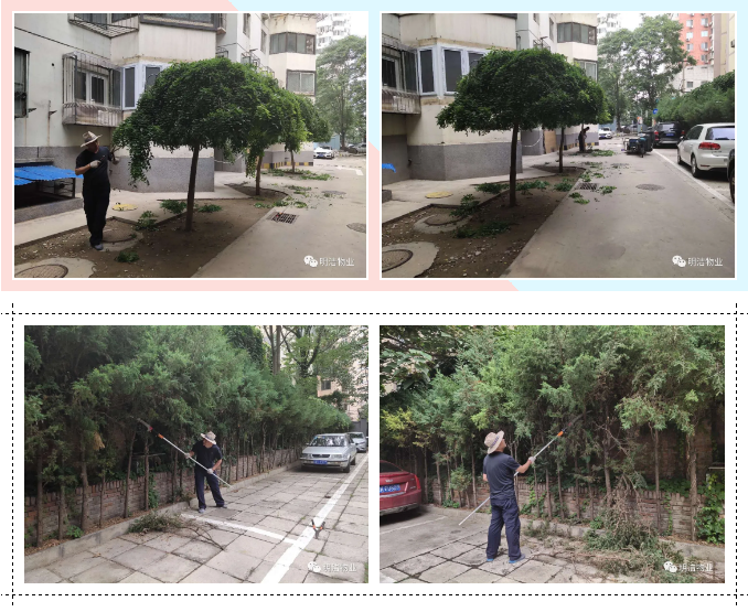 近期值盛夏,雨水量增大,树木浓密茂盛生长迅速,部分树木的枝条形状杂乱。为了给园区住户创造一个干净整洁的生活环境,为了保证家庭采光和园区的环境整洁舒适,明洁物业华威北里项目管理处对园区的树枝进行了修剪。